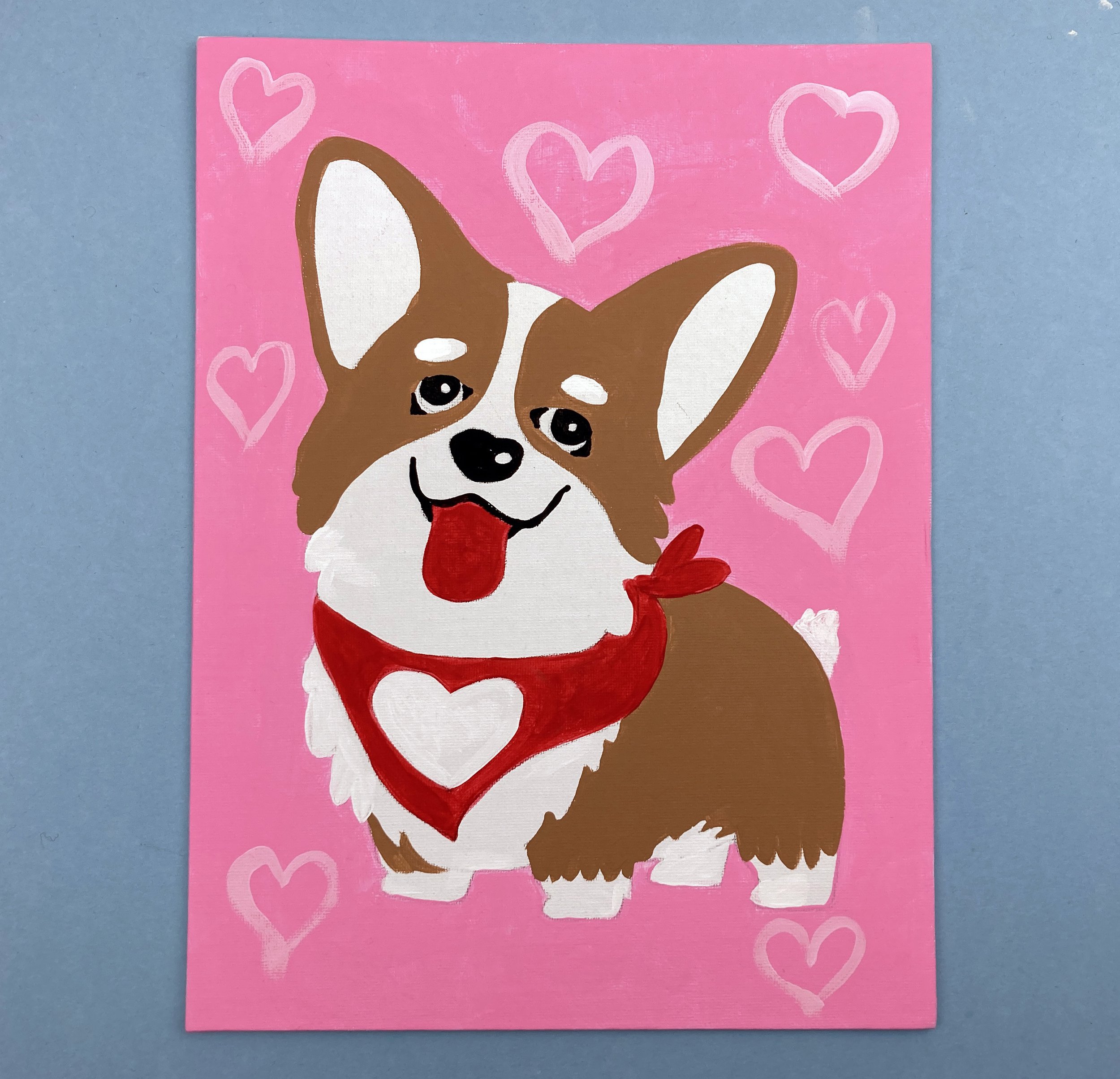 In this fun kids’ art class, students will paint an adorable corgi wearing a red bandanna with a heart! Make your painting unique by designing your own background or adding cute accessories like a hat, bow, or sunglasses. This program is the perfect mix of guided instruction and personal creativity.