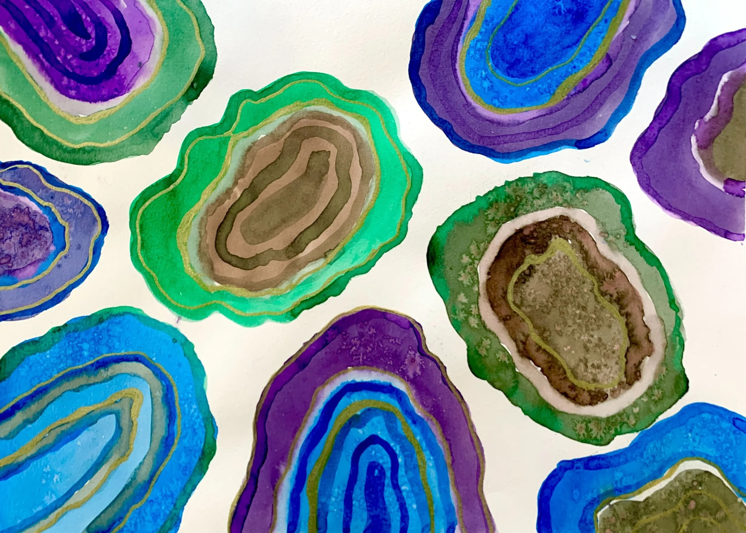 Create a beautiful watercolor painting of an agate slice. Learn how to use a wet on wet watercolor technique and salt on wet watercolor paint. This painting is easy and fun to do. Leave the class with a striking piece of art to give as a gift or hang on your wall!