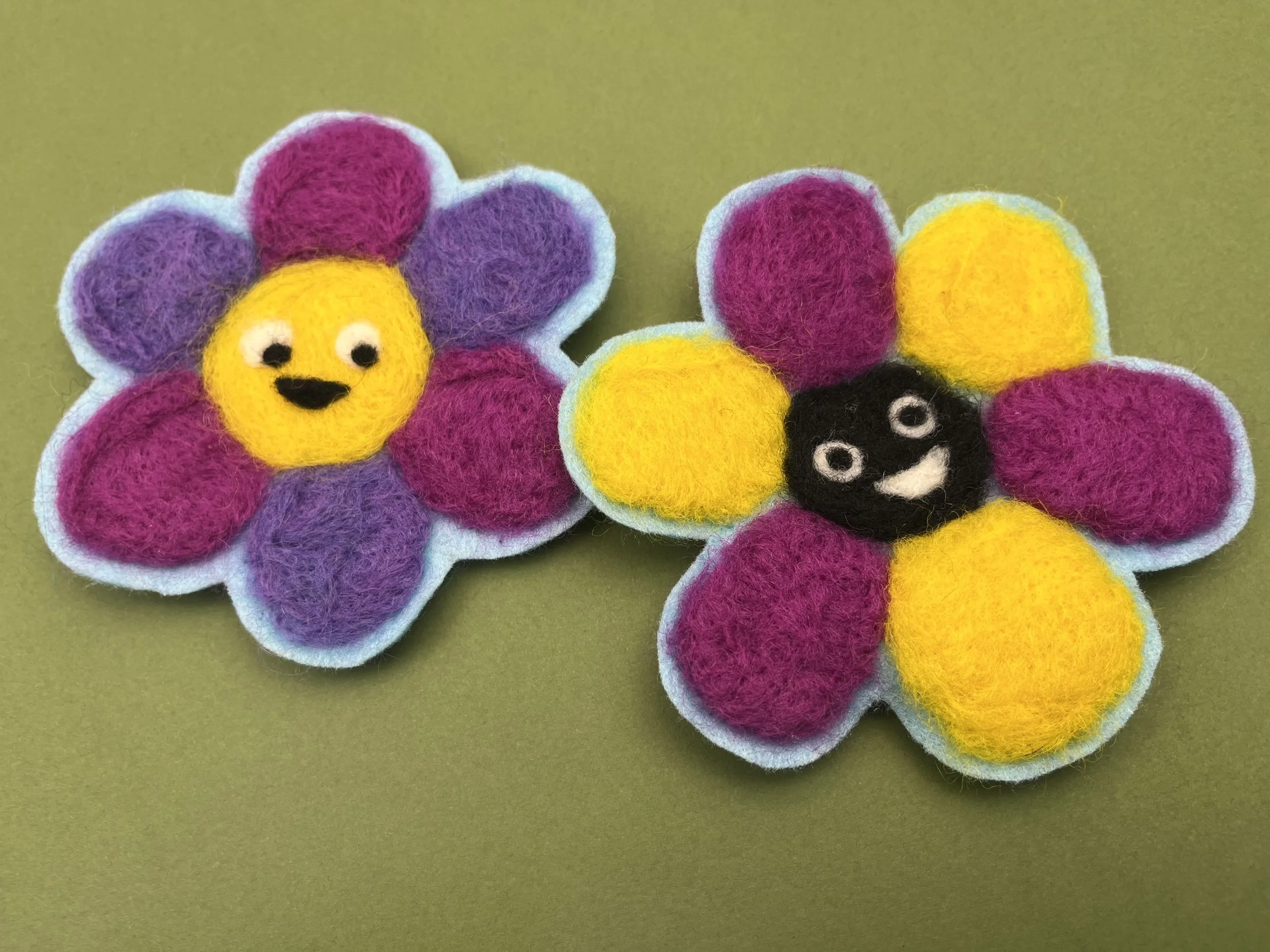 Needle felt daisy-like flower patches featuring a happy smiley face at the center, using soft wool and simple felting techniques. This is a fun and approachable project that is perfect for beginners. Students will be able to customize their flowers to match their own style and personality